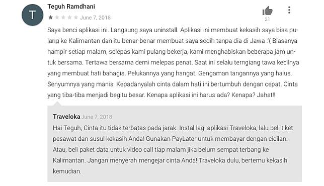 Baru-baru ini aplikasi booking online Traveloka mendapat review panjang dari seorang penggunanya. Bukan kendala atau kepuasan, sang pengguna mengaku membenci Traveloka karena dianggap menjadi pihak yang mengganggu hubungan cintanya.