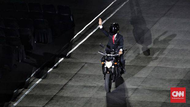 "Siapa yang menerbangkan sepeda motor, meliuk-liuk, bergaya stoppie, dan sampai tepat waktu ke GBK, semalam? Hehehe," kata Jokowi melalui Twitternya.