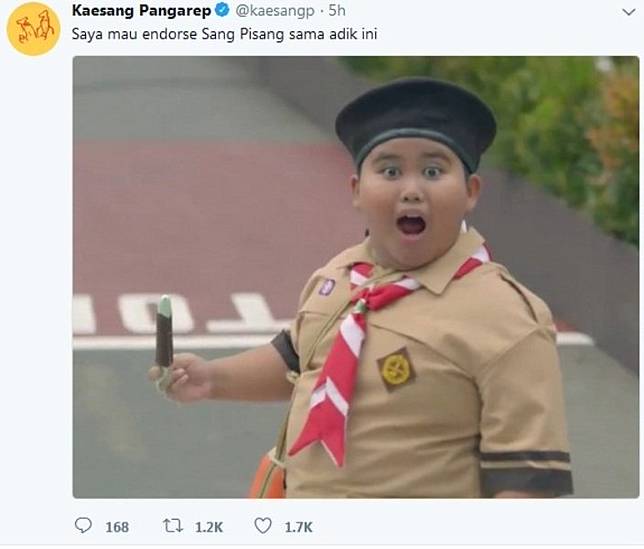 “Saya mau endorse Sang Pisang sama adik ini,” tulis Kaesang melalui akun Twitter@kaesangp.